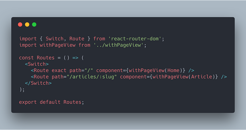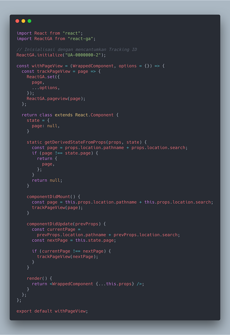 Kemudian, kita perlu meng-import library tersebut dan melakukan konfigurasi.import ReactGA from 'react-ga';...ReactGA.initialize('TRACKING-ID'); // Ganti TRACKING-ID dengan Tracking ID website kamu. cth: UA-000000–2