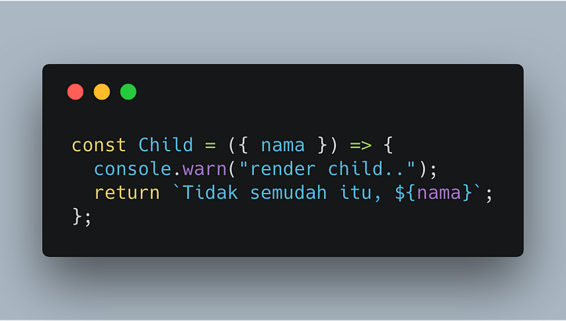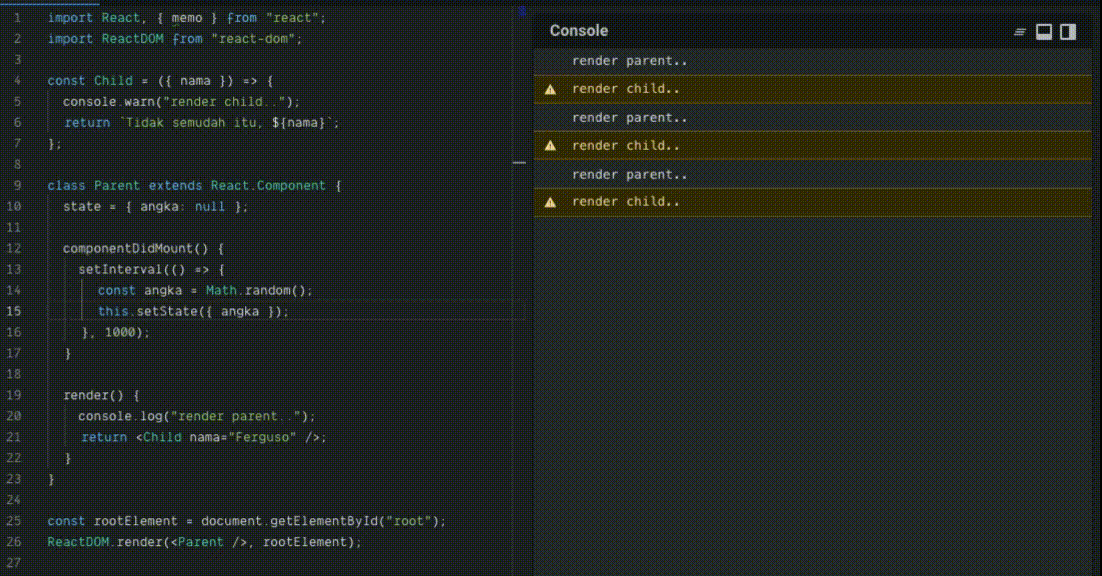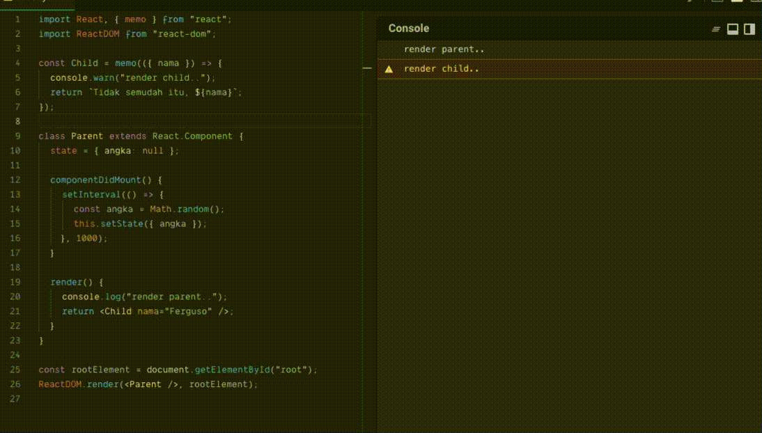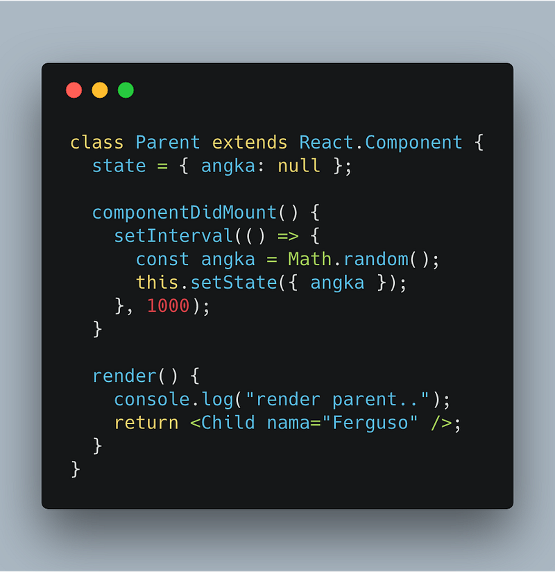 Pertama-tama, kita akan membuat parent component, dengan tag <Parent> yang akan melakukan perubahan state setiap detik, yang artinya <Parent> akan render ulang setiap perubahan state. Kalian bisa lihat percobaan ini di codesandbox.